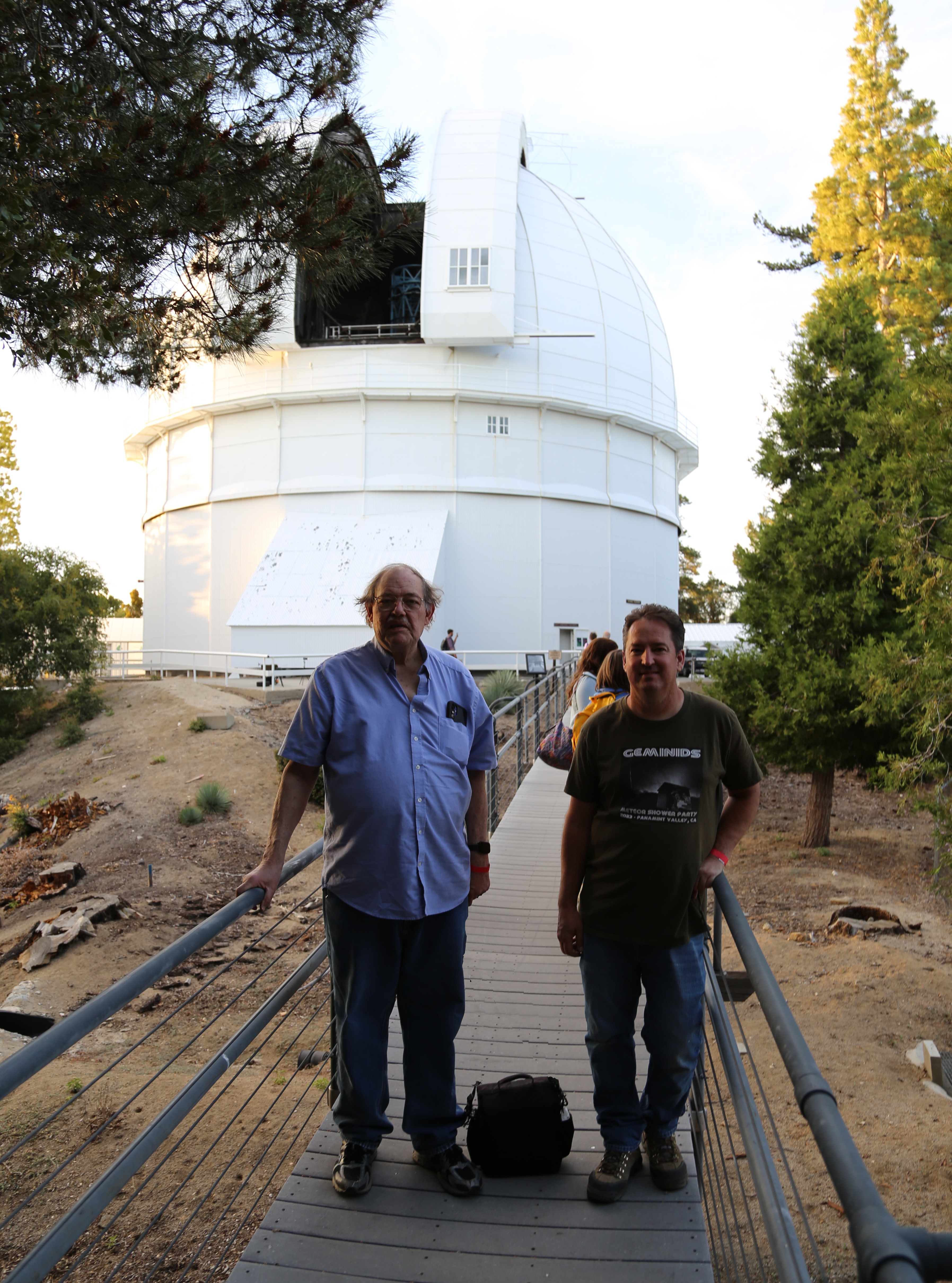 Photographed on June 14, 2025, Dave Simpson (Left) and I (James Hutchinson Right) stand on the historic bridge in front of the 100-inch Hooker Telescope at Mount Wilson Observatory. This vantage point overlooks one of the most important instruments in the history of astronomy—where humanity first grasped the true scale of the universe. Same Bridge. Same Telescope. Ninety-Four Years Apart. Two moments separated by nearly a century—connected by place, curiosity, and the pursuit of understanding the universe.
